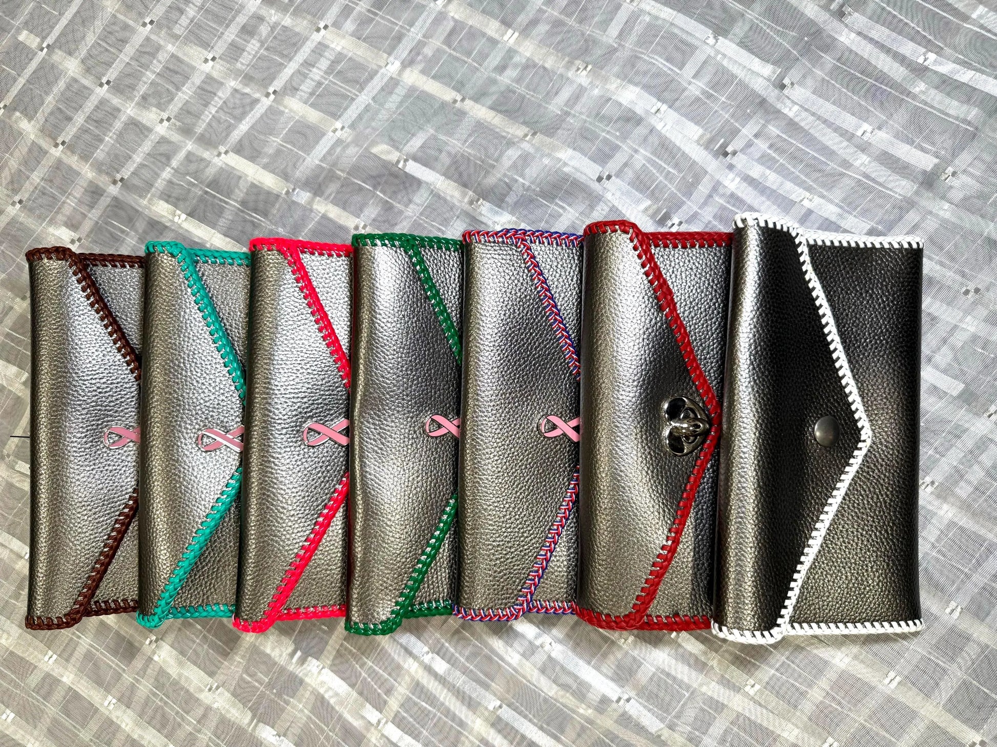 Double looped with various colored lace along the edges, a Breast Cancer Ribbon Snap to support “awareness” [My wife was a two-time cancer survivor and the love of my life! She is in everything I create and please take notice that a portion of the proceeds will be donated to cancer research in her honor.] I designed and hand-stitched the Mission Grained Leather Interior* that holds; cell phone, cash, check book, documents, it also has a vinyl insert that holds; six (6) pictures, identification, business and/or credit cards, finally a compartment with a nickel bar snap enclosure for change, keys or small items. It measures 7 3/8” x 11 ½” open and 7 ¾” x 4” closed
